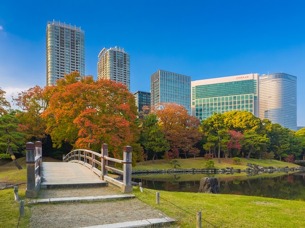 Shiodome is known as a business district, where tall buildings line the waterfront. One of its defining features, however, is nearby "Hamarikyu Gardens", one of the finest Japanese-style landscaped gardens in Tokyo. This captivating park is famed for its flowers, and its changing face with the turning of the seasons is a delight to watch.