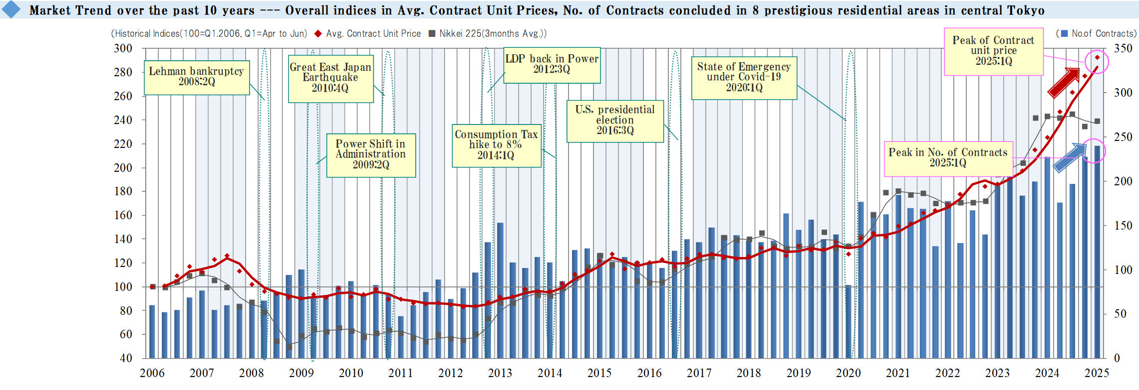 Major economic events and Nikkei Stock Average are also shown for reference. The bar graph represents the number of contracts concluded each quarter. The red-line shows a movement in the index of average contract price per tsubo, while the gray-line shows one in the Nikkei stock average.