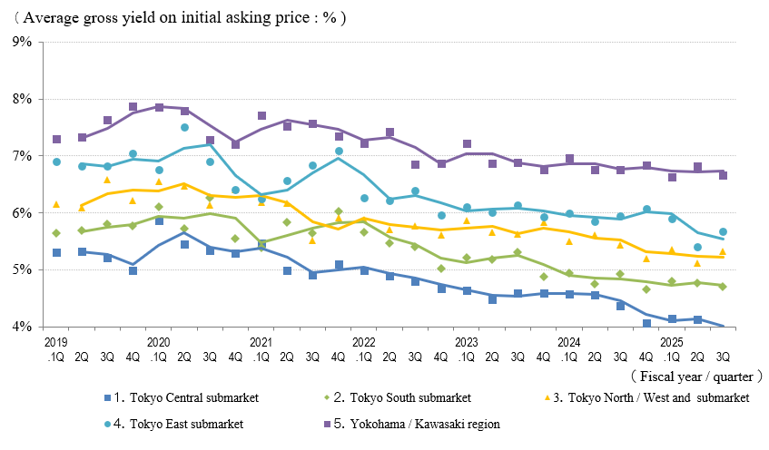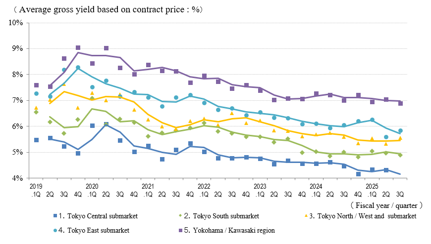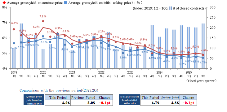 The indices of the average gross yield on the initial asking price and on the contract price were down by 0.2 points and 0.3 points quarter over quarter (QoQ) (prices rose), respectively, in the Tokyo Central submarket in 3Q of FY 2025, while the number of contracts made increased YoY. However, since this includes multiple properties contracted at low yields, conceivably for purposes of vacating and redevelopment instead of yields, the decreasing trend in yields warrants further monitoring.