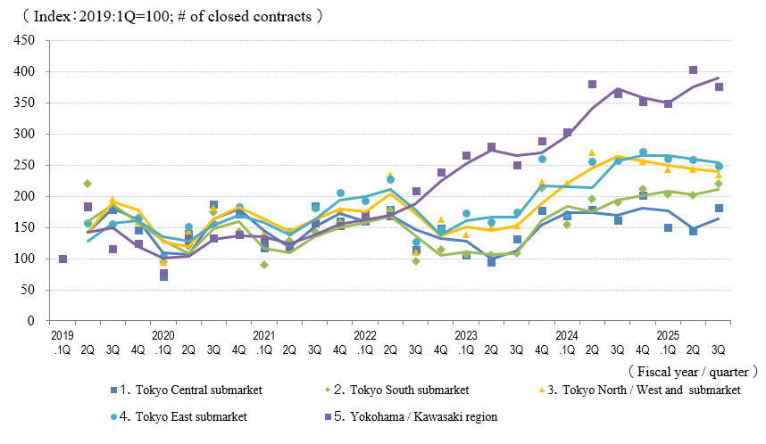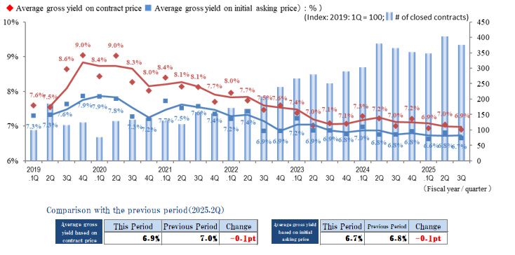 The indices of the average gross yield on the initial asking price and on the contract price both decreased slightly (prices rose) in the Yokohama / Kawasaki region in 3Q of FY 2025. Yields appear to be relatively stable over the past year or two, after they had been decreasing since 2020. While the number of contracts decreased from 2Q, when it reached a record high since data collection began in 2017, the market remains active, and numerous transactions took place during 3Q.