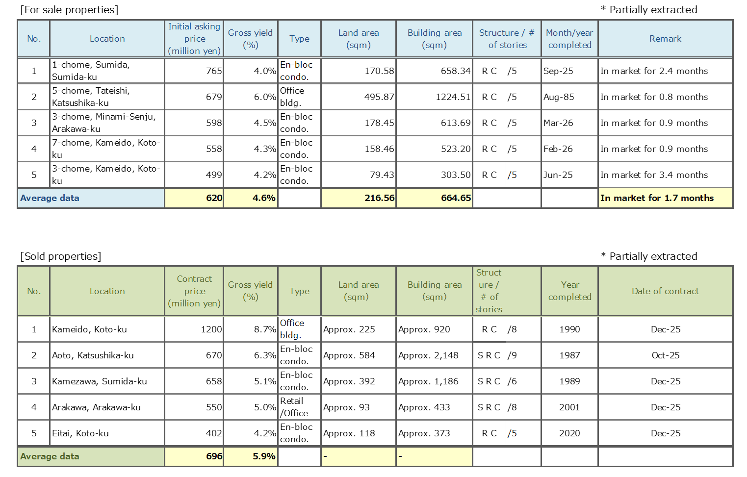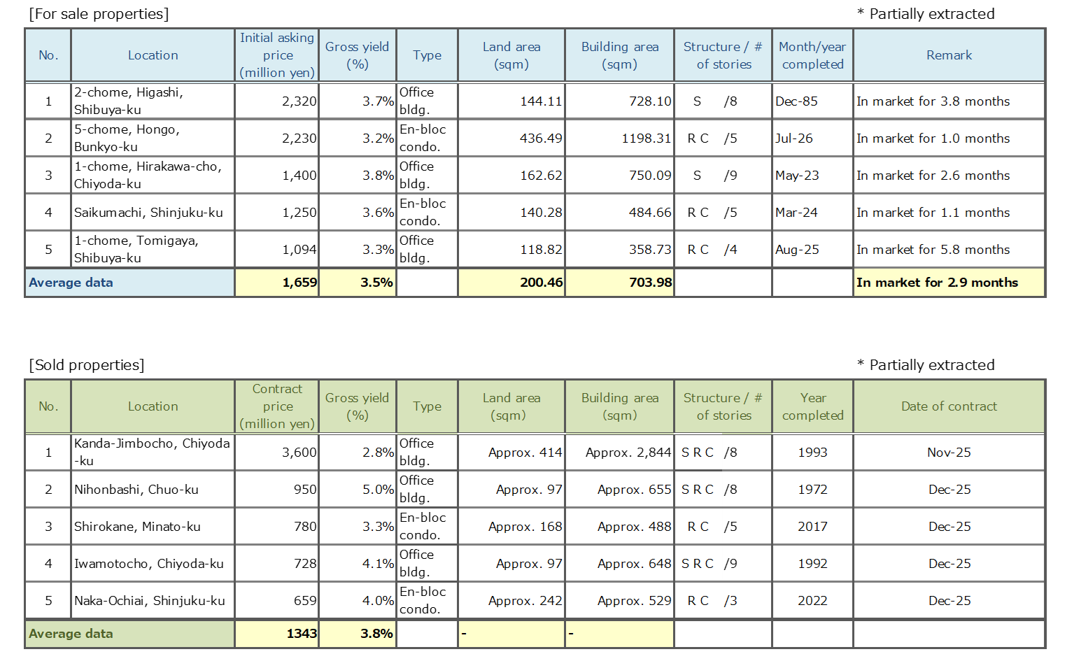 Data Source: Information is extracted from the database containing properties offered for sale and contracts concluded through Mitsui Fudosan Realty Network (En-bloc condominiums / office buildings / apartment buildings).