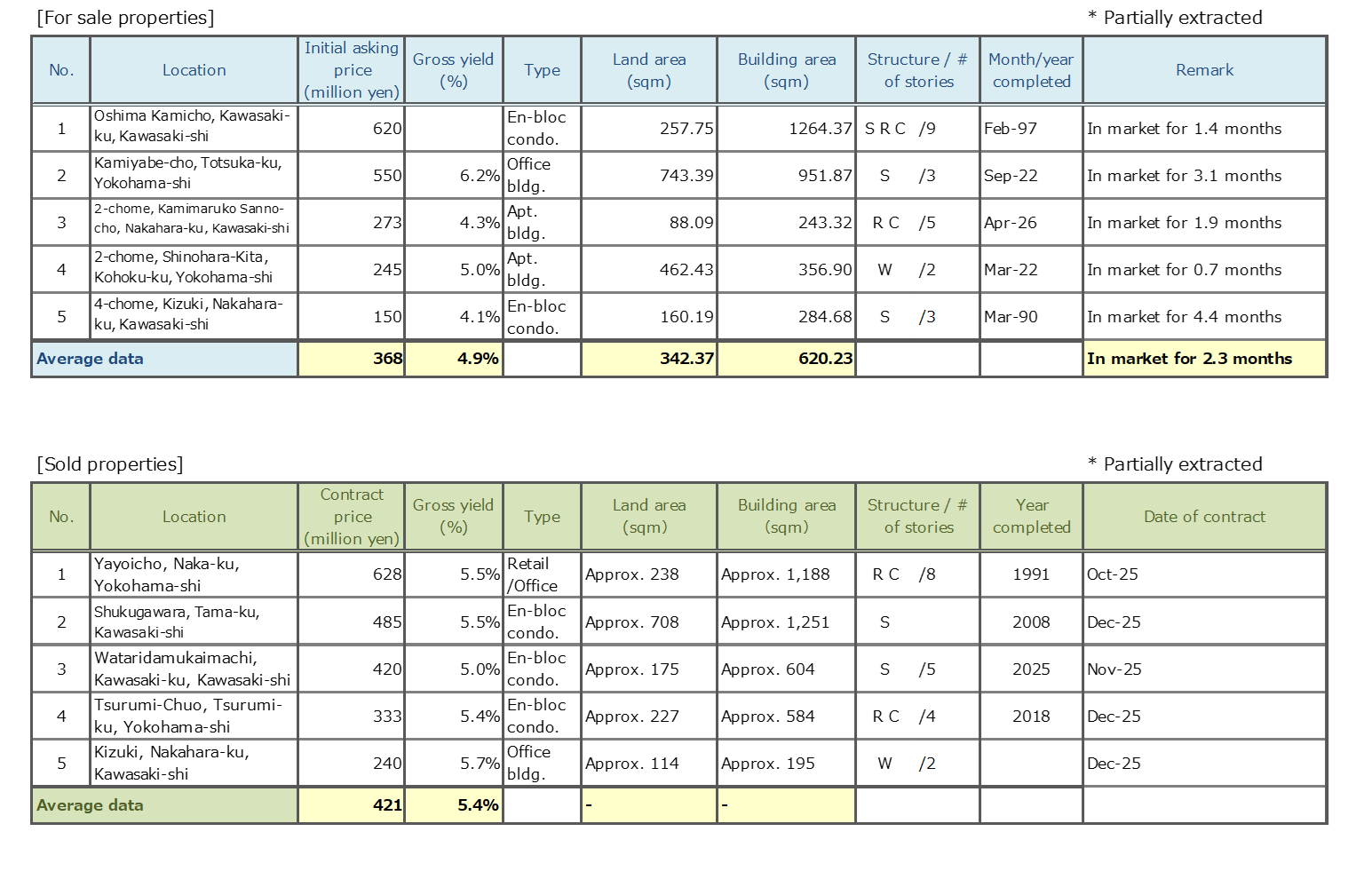 - Number of Transactions & Average Gross Yield on Contract Price: Number of contracts closed in a quarter (three months) and average gross yield of them (including estimated values)